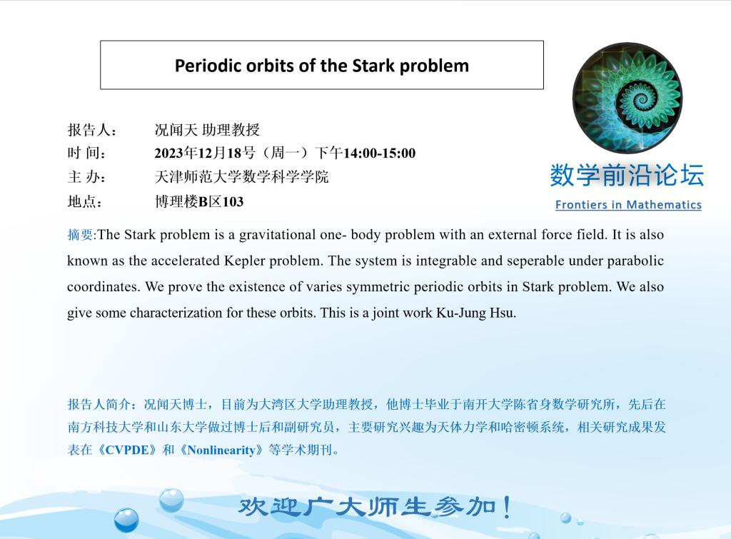 【预告】学术报告(2023-43)12月18日—Periodic orbits of the Stark problem