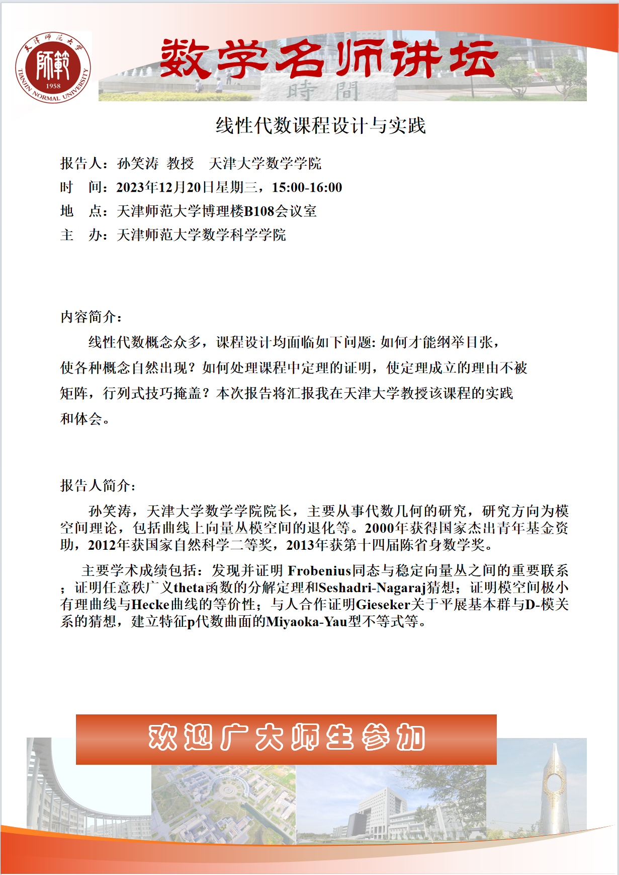 【预告】学术报告(2023-45)12月20日—线性代数课程设计与实践