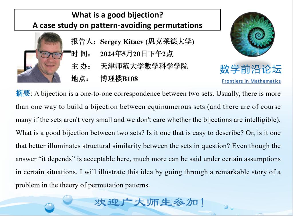 【预告】学术报告(2024-11)5月20日——What is a good bijection?A case study on pattern-avoiding permutations?